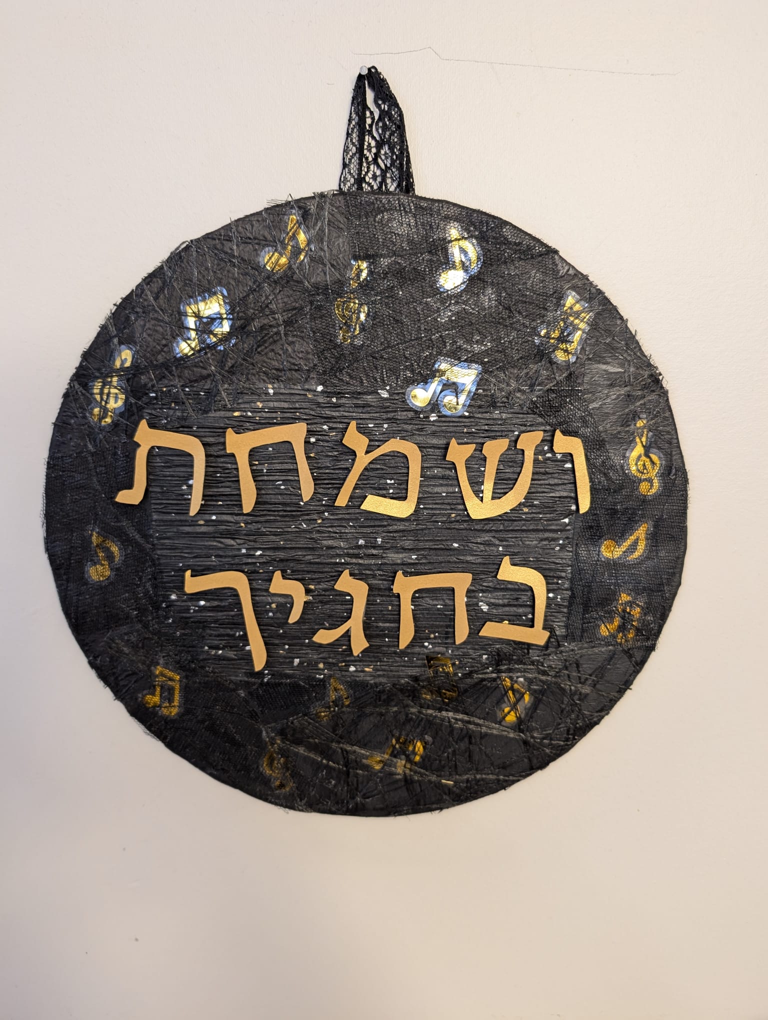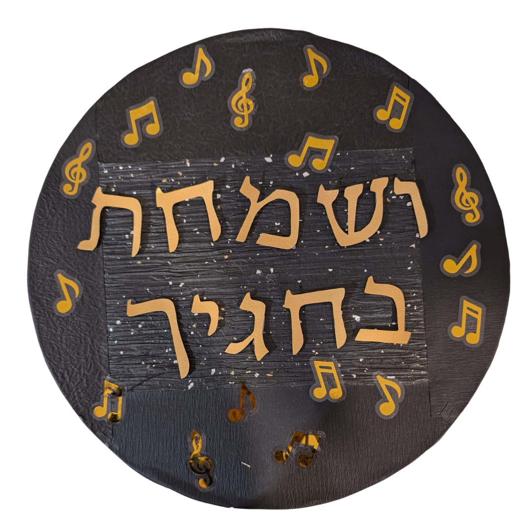 This round "Visamachta Bichagecha" sign is a sophisticated addition to your sukkah walls. It's easily created using a round basal wood base, textured decoupage paper and musical notes stickers.