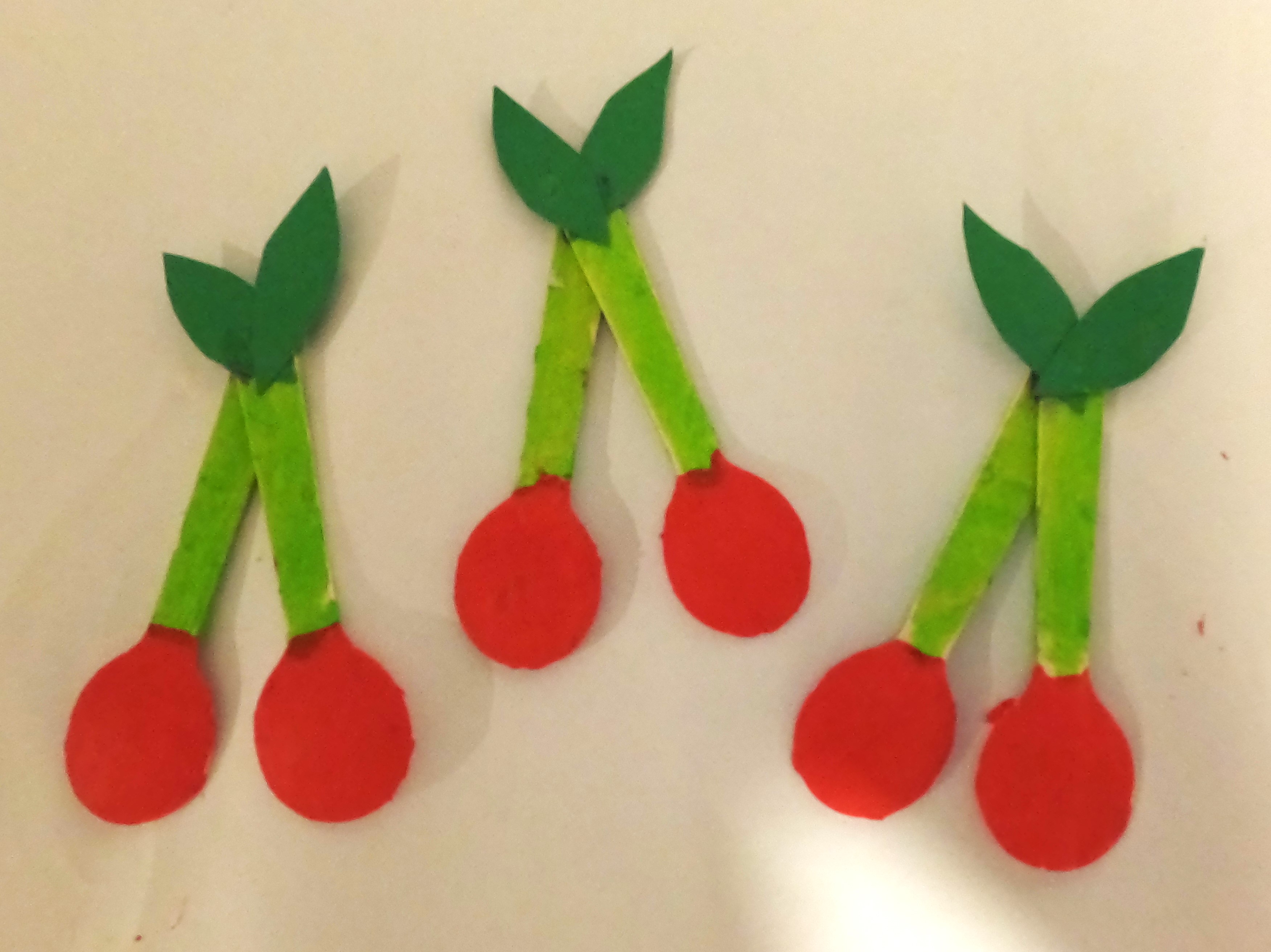 5. Glue the paper leaves onto the joined "stems" of the cherry