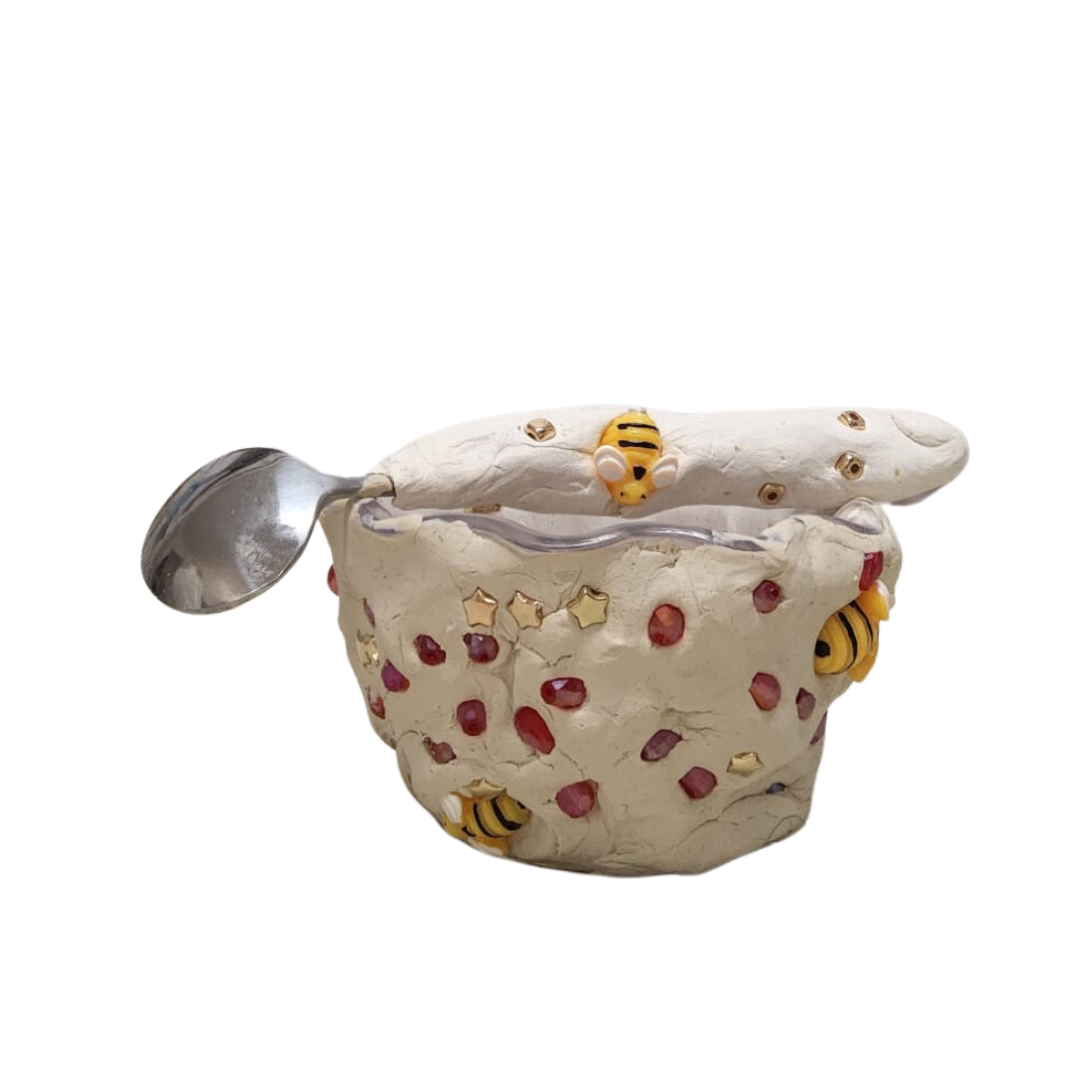 1. Take a nice chunk of clay. 2. Press it firmly all around the sides of the serving dish 3. Gently push any desired beads deep into the clay 4. Roll a cylinder of clay as long as the spoon handle 5. Press the spoon handle into the clay and wrap the clay carefully around it 6. Gently push any desired beads onto the clay 7. Wait 24-48 hours for the clay to dry completely 8. "Paint" the clay using the acrylic paint pens