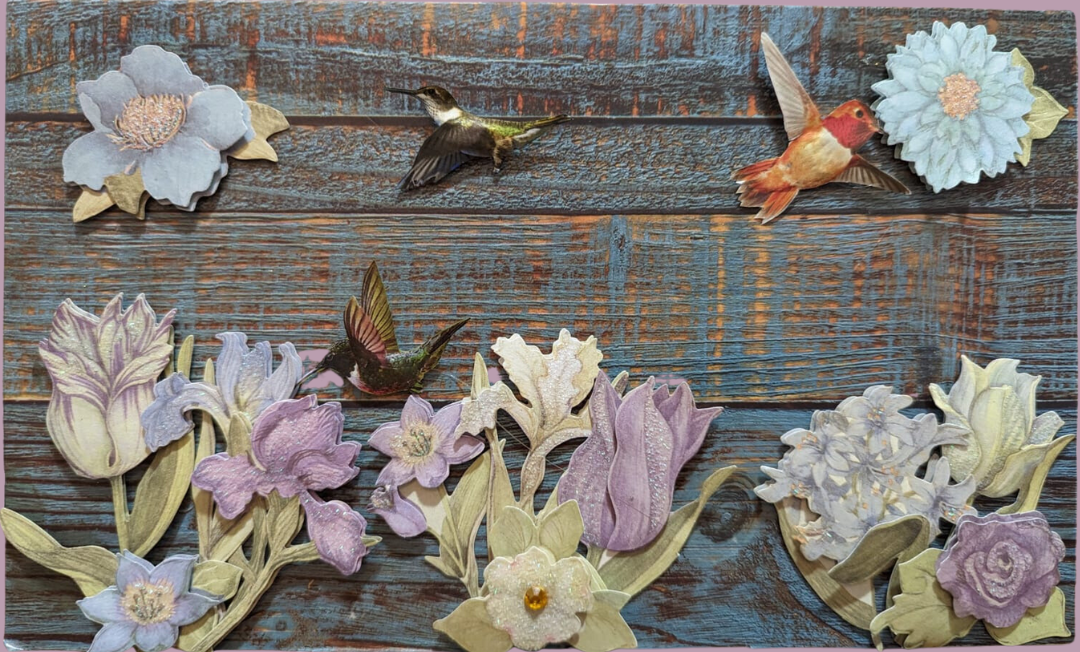 1. Put the wooden board on the decoupage paper 2. Trace the shape with pencil 3. Cut out the paper carefully 4. Liberally apply the spray adhesive glue to the board 5. Carefully press the paper onto the board. Use a card to avoid bubbles. 6. Arrange the flower, bird and butterfly stickers on the board as desired.